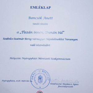 2026.03.24-én a Nyíregyházi Művészeti Szakgimnáziumban a "Tiszán innen, Dunán túl” Szabolcs-Szatmár-Bereg vármegyei népdaléneklési versenyen a Tuzséri dalos pacsirták csoportja bronz minősítést érdemelt ki a zsűritől. Büszkék vagyunk arra, hogy a csapat tagjai között ott volt Bancsók Anett, a Garabonciás Művészeti Iskola növendéke is. Mellette az intézmény több tanulója is részt vett a versenyen, akik mindannyian méltó módon és magas színvonalon képviselték iskolájukat.