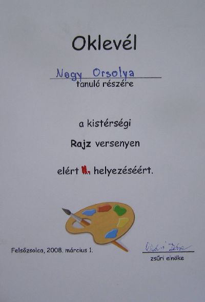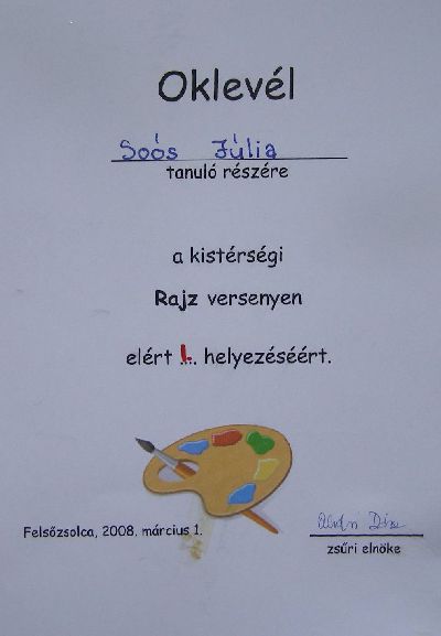 Soós Júlia (6. o.) tanulmányrajz kategóriában az 5-6 osztályosok között I. helyezést ért el és továbbjutott az április közepén megrendezésre kerülő miskolci megyei rajzversenyre. (001, 005 kép)